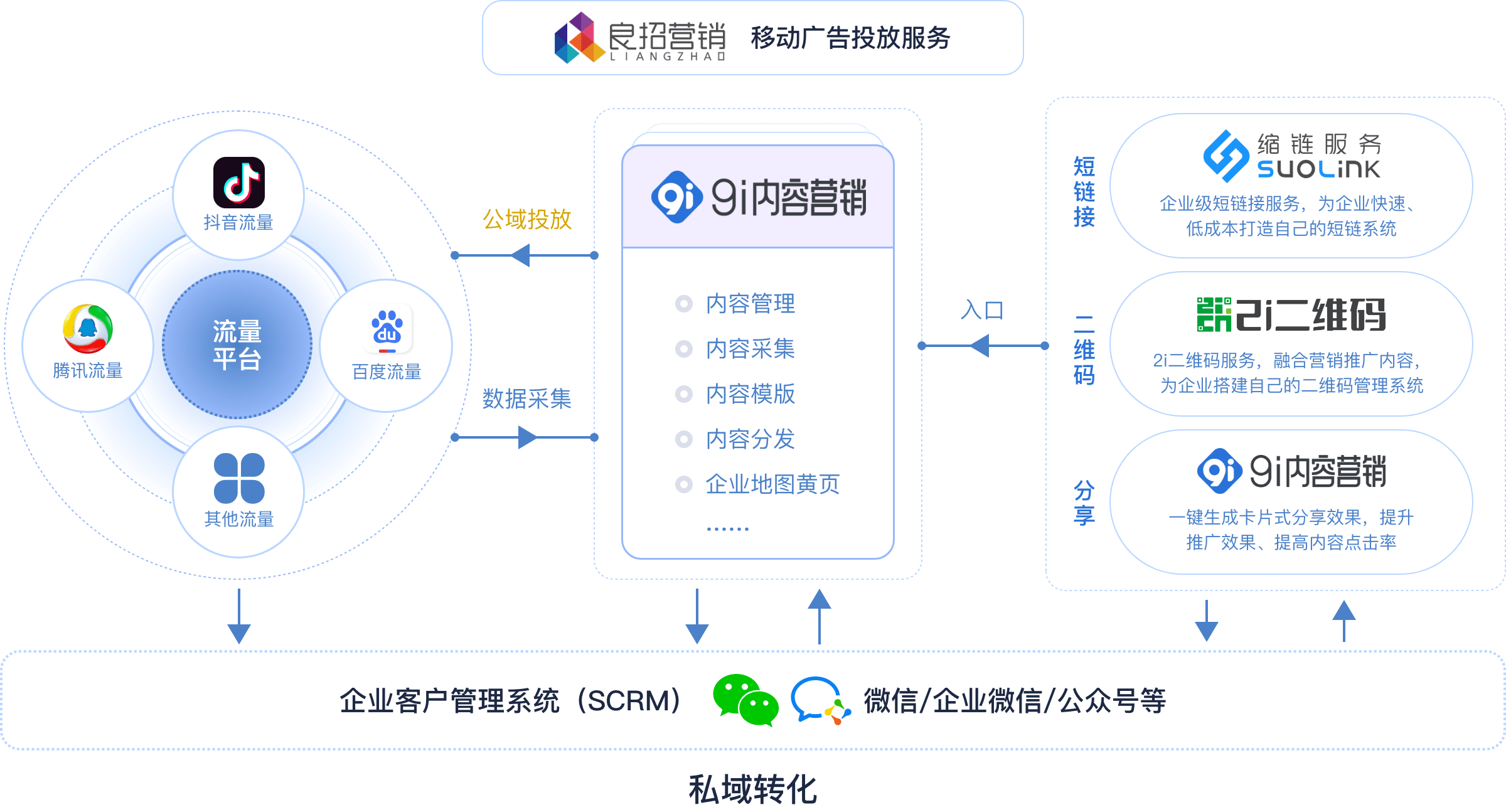 整合各类线上营销触点,为企业提升品牌曝光,有效获取意向用户,花更少的钱,达到更好的效果